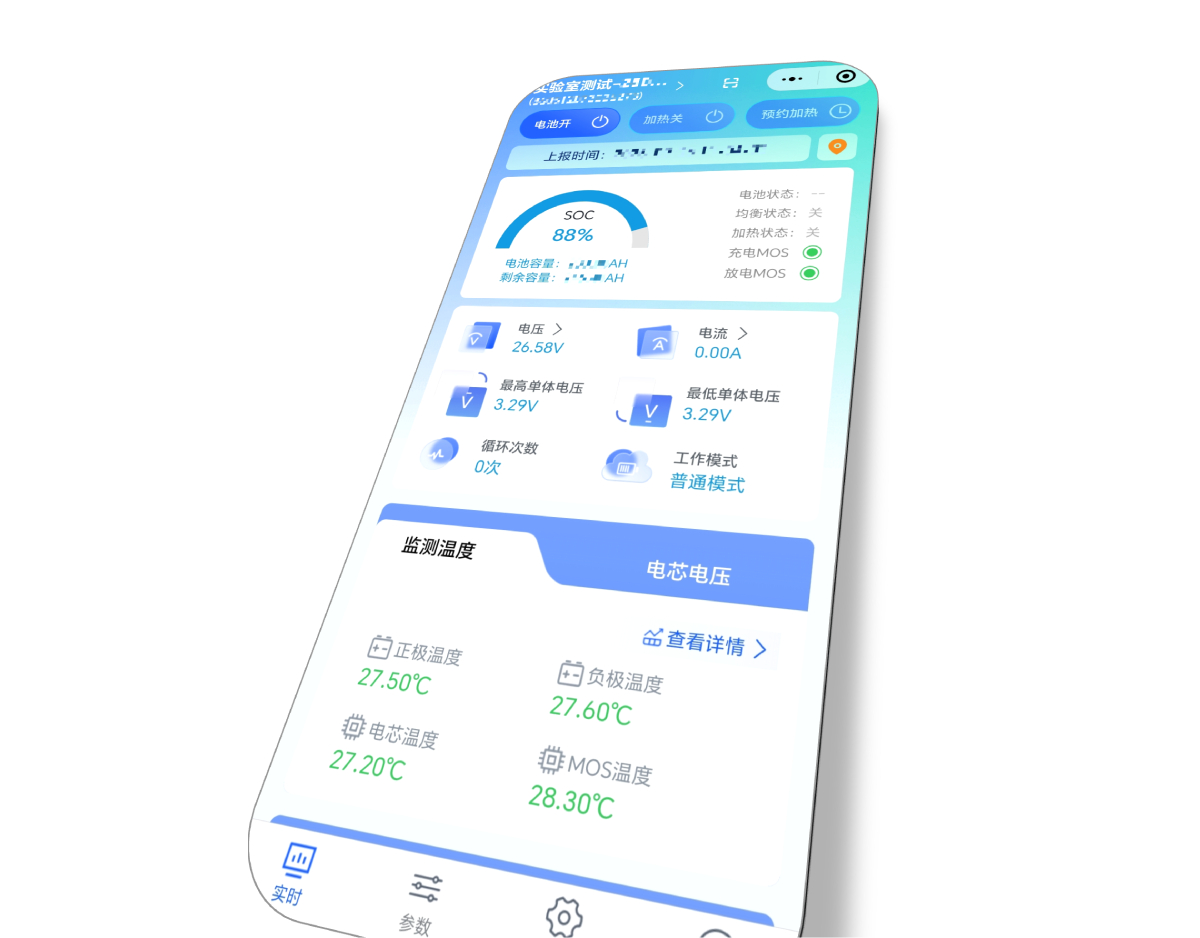 实时监控,一切尽在掌握。电池开关、电量、电压、电流、温度、加热等。